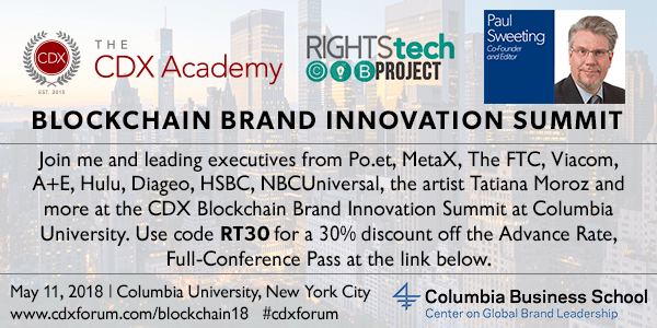The RightsTech Project’s Paul Sweeting will be moderating a panel on Empowering Creators to Protect and Monetize Their Content at the CDX Academy Blockchain Brand Innovation Summit on May 11 at Columbia University in New York. Joining Sweeting on the panel will be singer/songwriter, RightsTech veteran and founder of CryptoMedia Hub Tatiana Moroz; founder and CEO of Po.et Jarrod Dicker; and the worldwide director of the Innovation Group at J. Walter Thompson, Lucie Greene.